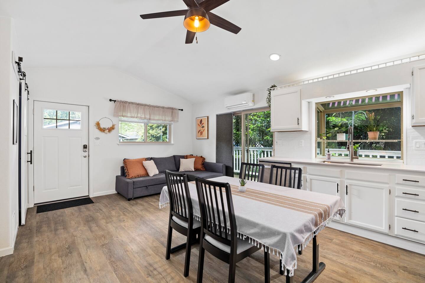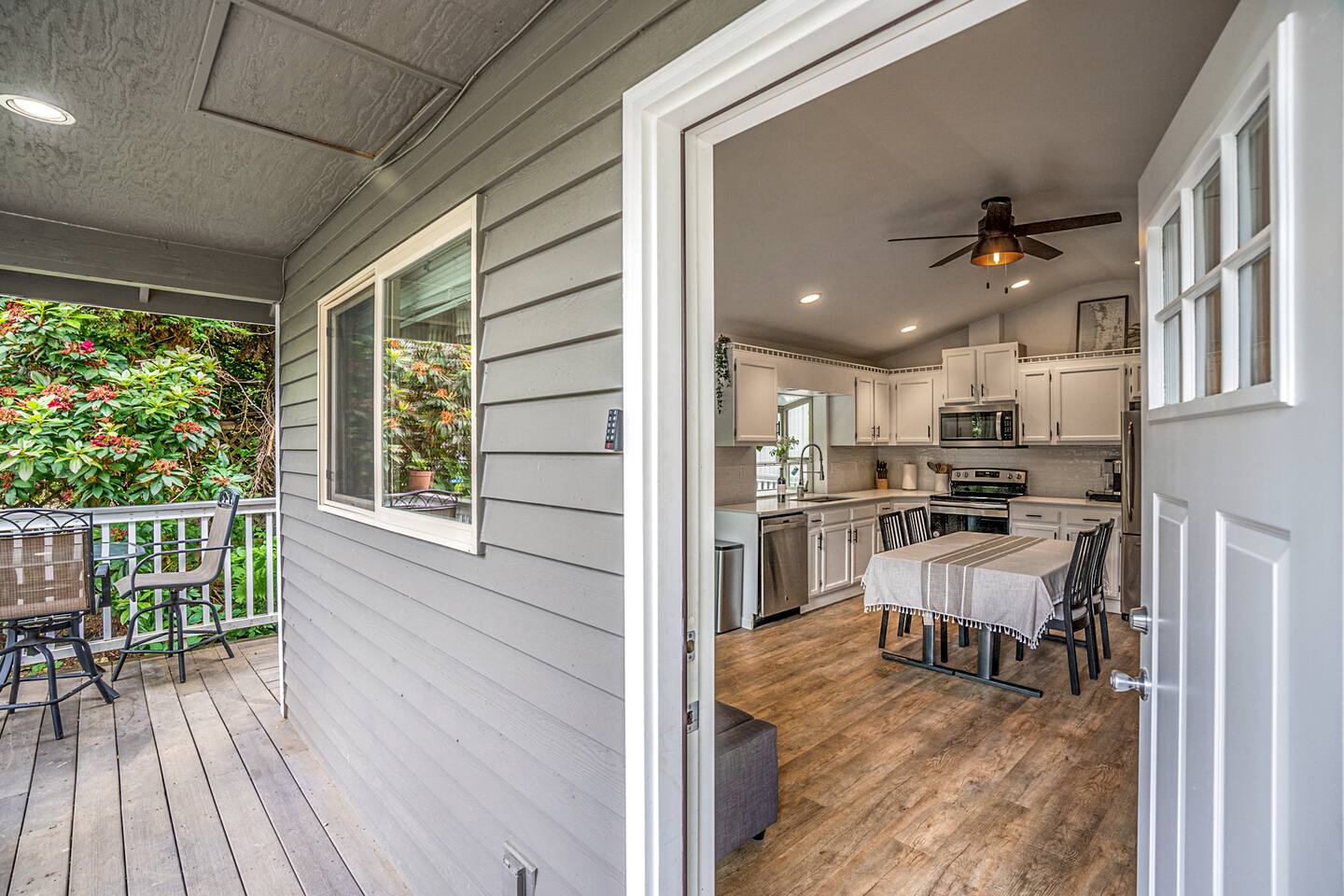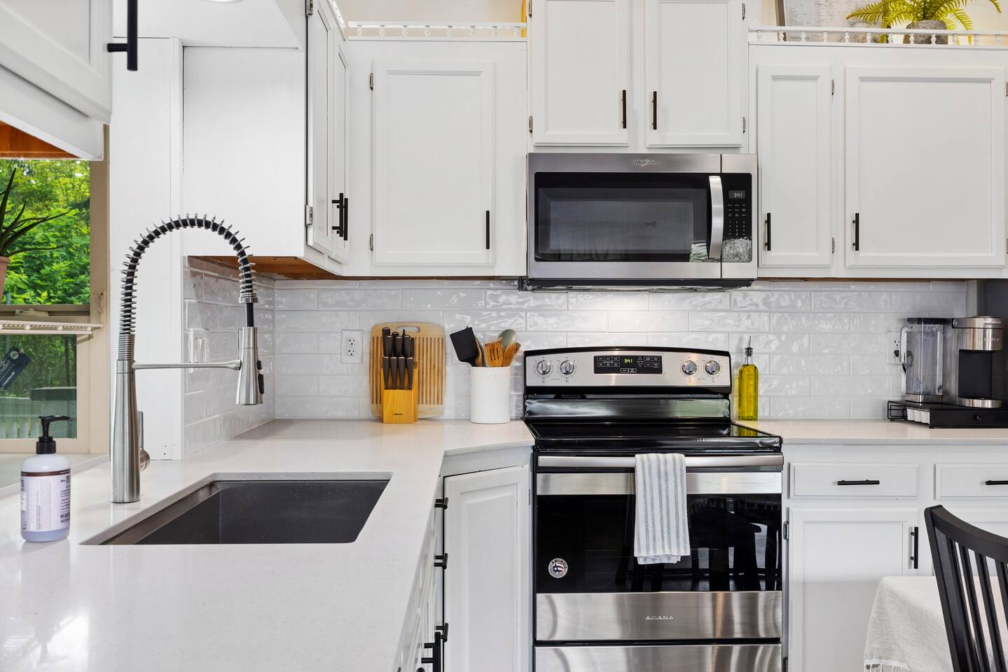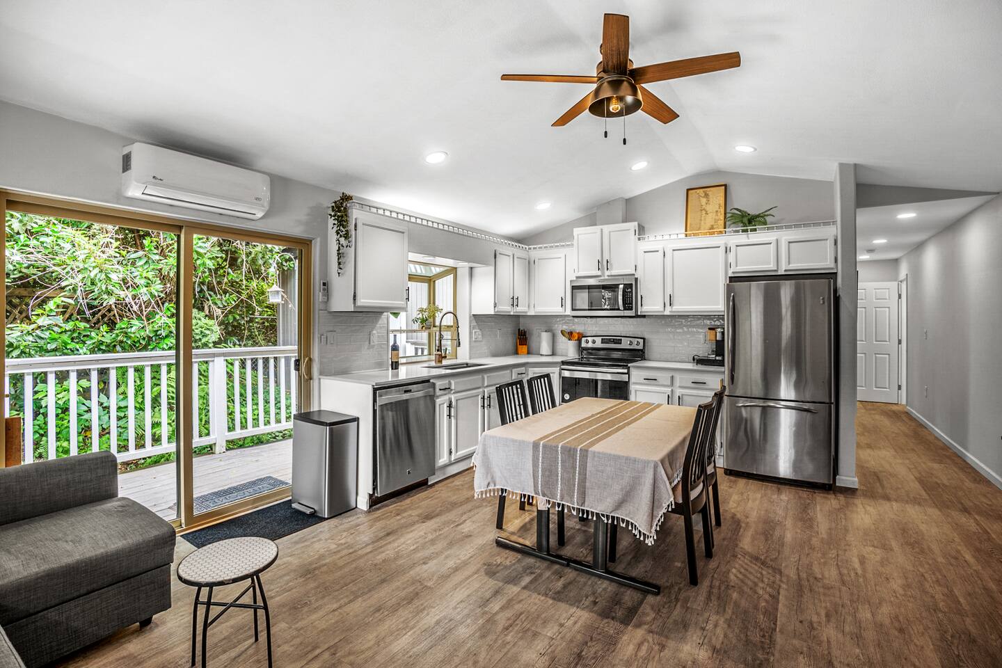 The primary bedroom has a memory foam Queen-size bed with views looking out to the serene backyard and patio. Sit back on the comfortable patio furniture with your morning coffee from the Keurig, or enjoy the evening sun with a glass of wine from one of the many local wineries nearby. The second bedroom has a memory foam Full-size bed. Both rooms have closets with hangers provided. The couch in the living room pulls out to make a Full-size bed if you have extra guests (please keep in mind there will be a fee for any additional guest over 4). Extra linens, pillows and blankets can be found by opening up the chase on the couch. Lay back and catch up on all your favorite shows on the 65" Smart TV. We have an A/C unit in the living room that cools the whole house, extra fans or heaters can be found in the coat closet by the front door. The kitchen is equipped with new stainless steel appliances, large farmhouse style sink, dishwasher, microwave, toaster, Keurig (with complimentary coffee, tea and sugar), and all the necessary cookware to create delicious home-cooked meals during your stay. Fast WiFi: 300mbps