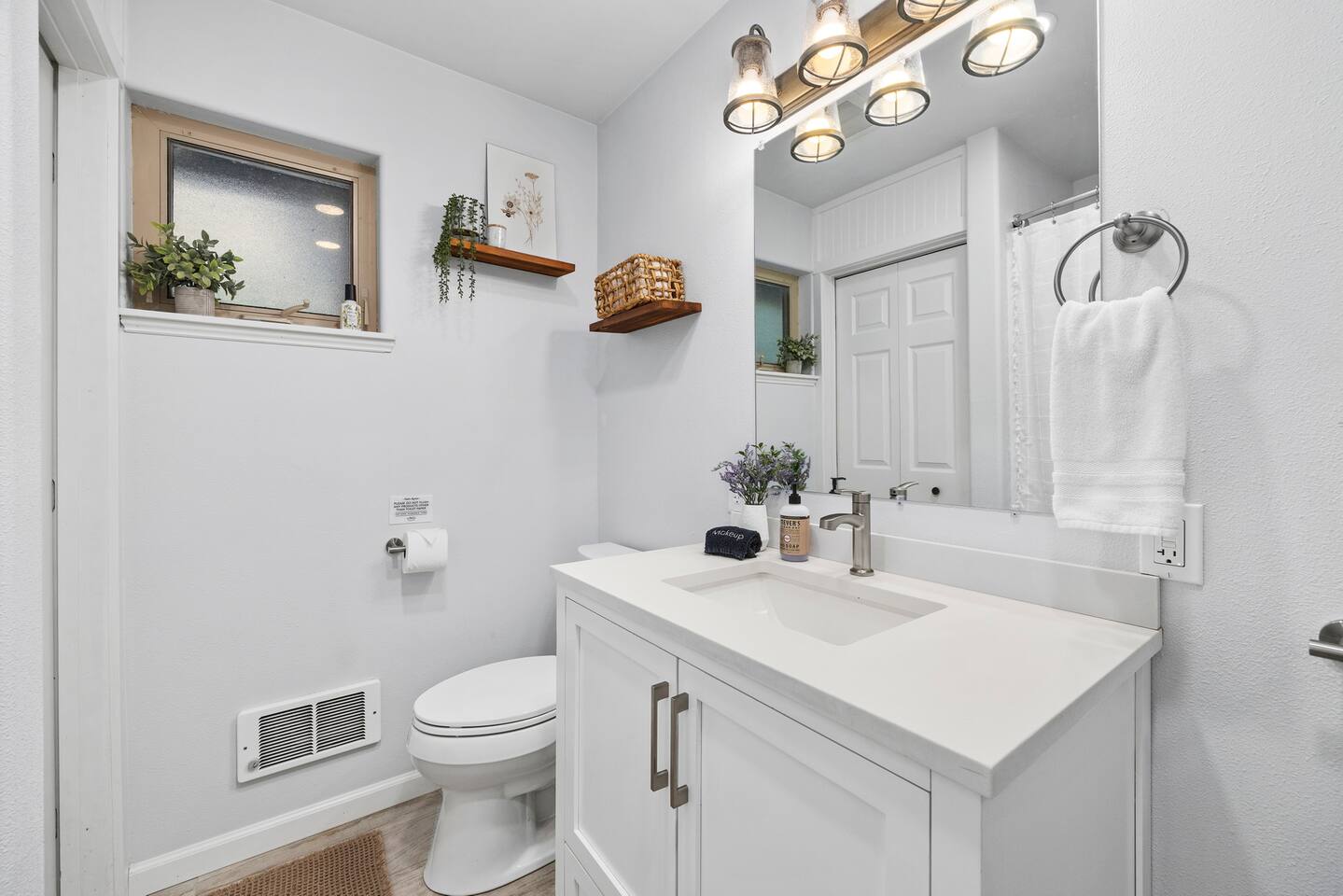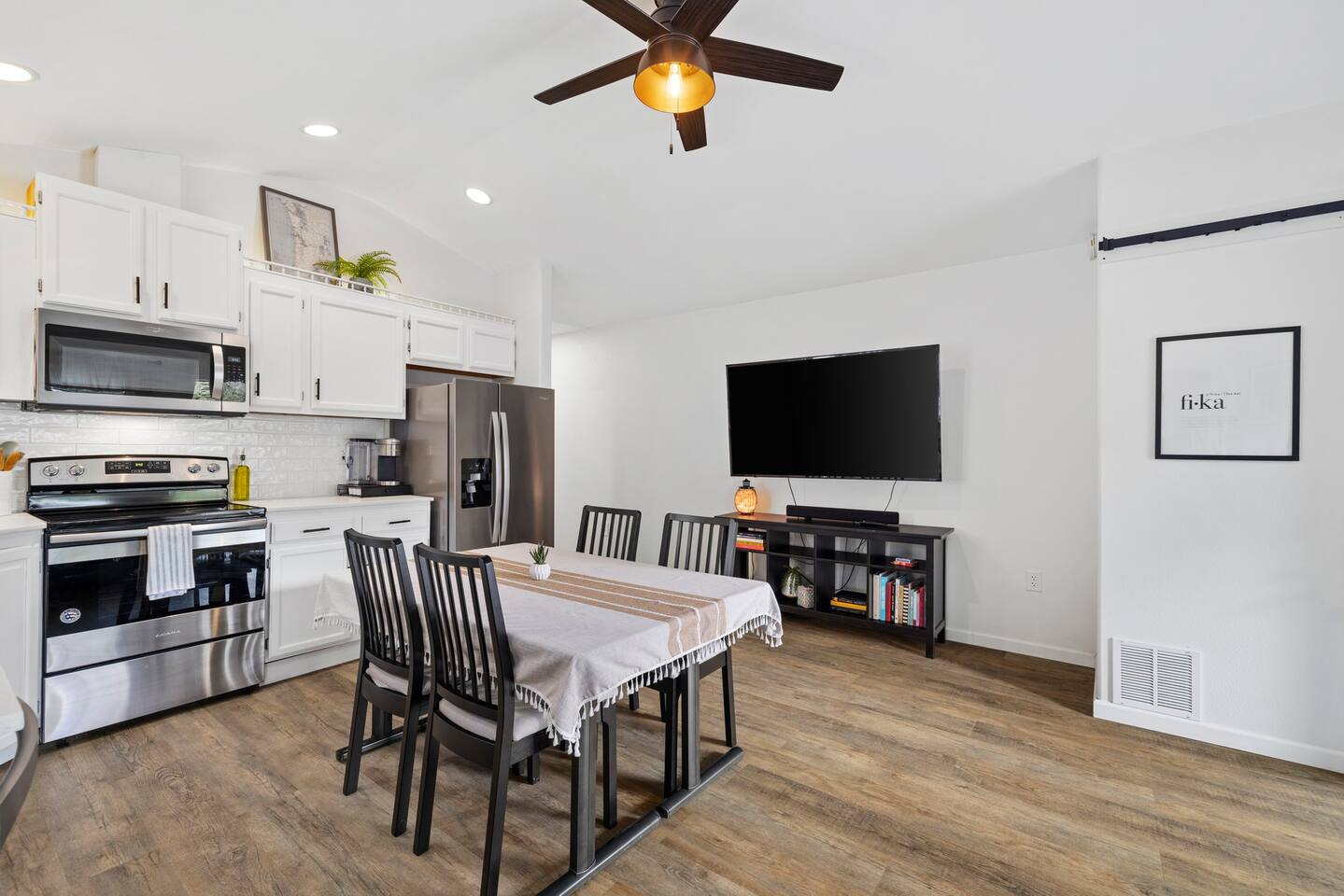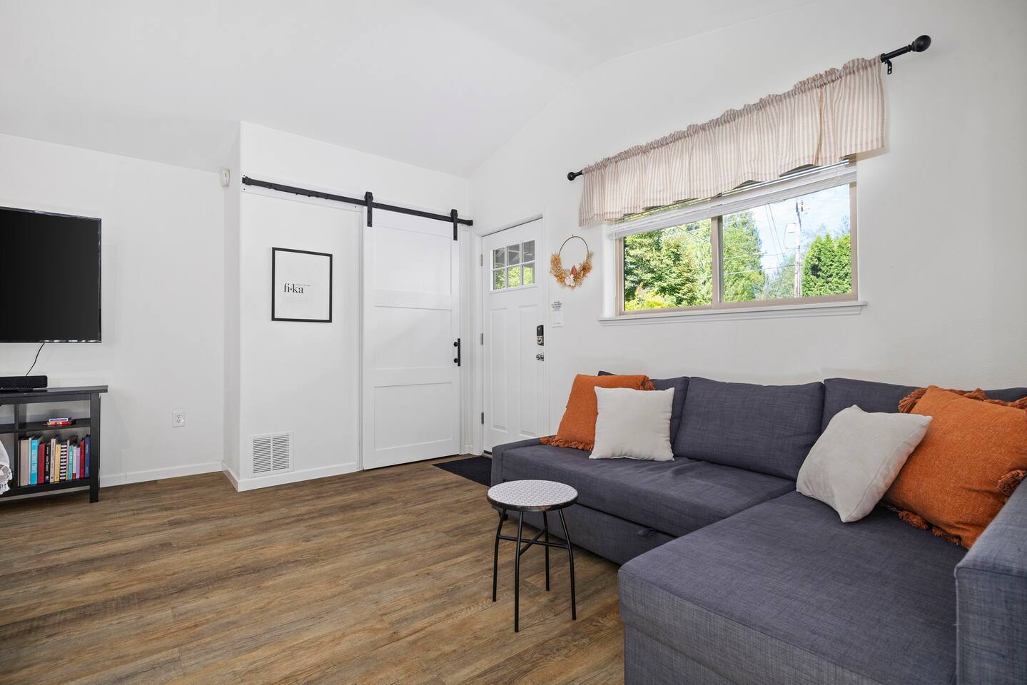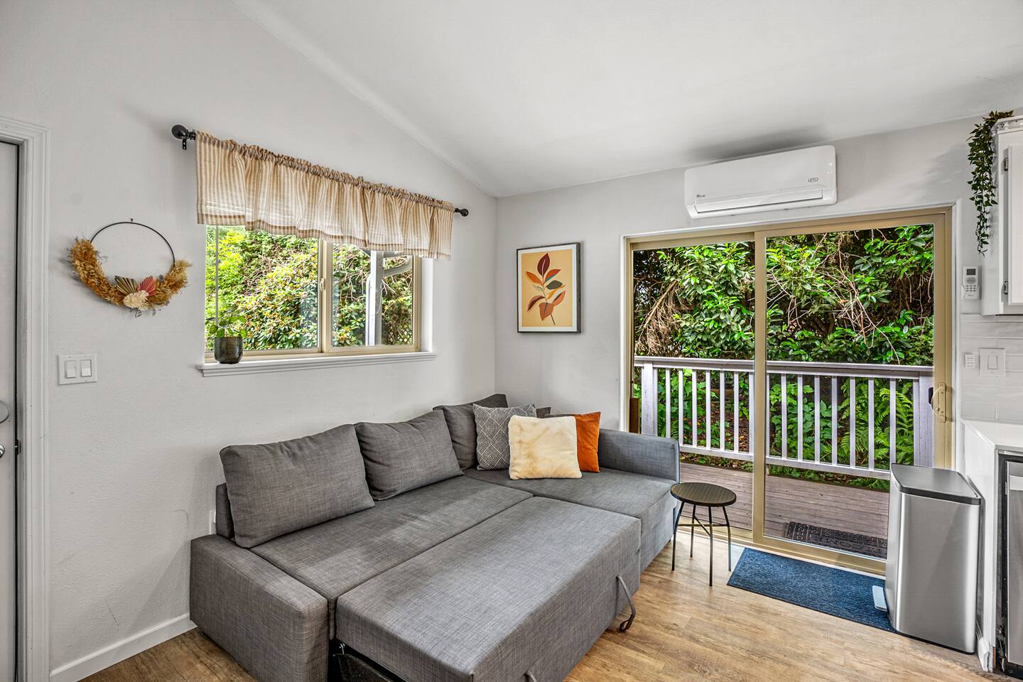 The primary bedroom has a memory foam Queen-size bed with views looking out to the serene backyard and patio. Sit back on the comfortable patio furniture with your morning coffee from the Keurig, or enjoy the evening sun with a glass of wine from one of the many local wineries nearby. The second bedroom has a memory foam Full-size bed. Both rooms have closets with hangers provided. The couch in the living room pulls out to make a Full-size bed if you have extra guests (please keep in mind there will be a fee for any additional guest over 4). Extra linens, pillows and blankets can be found by opening up the chase on the couch. Lay back and catch up on all your favorite shows on the 65" Smart TV. We have an A/C unit in the living room that cools the whole house, extra fans or heaters can be found in the coat closet by the front door. The kitchen is equipped with new stainless steel appliances, large farmhouse style sink, dishwasher, microwave, toaster, Keurig (with complimentary coffee, tea and sugar), and all the necessary cookware to create delicious home-cooked meals during your stay. Fast WiFi: 300mbps