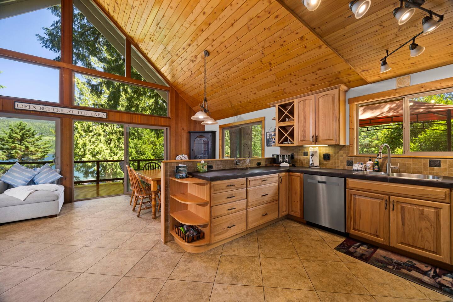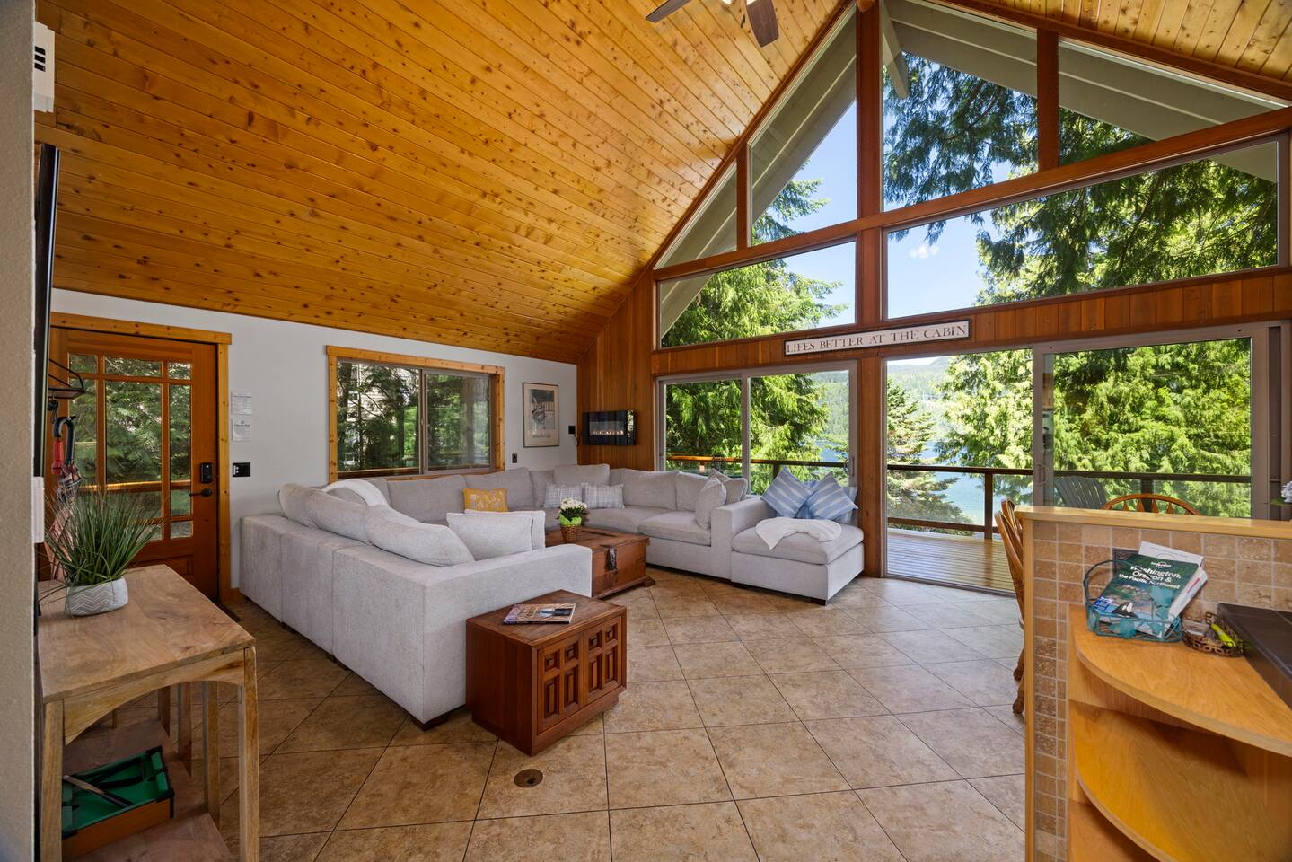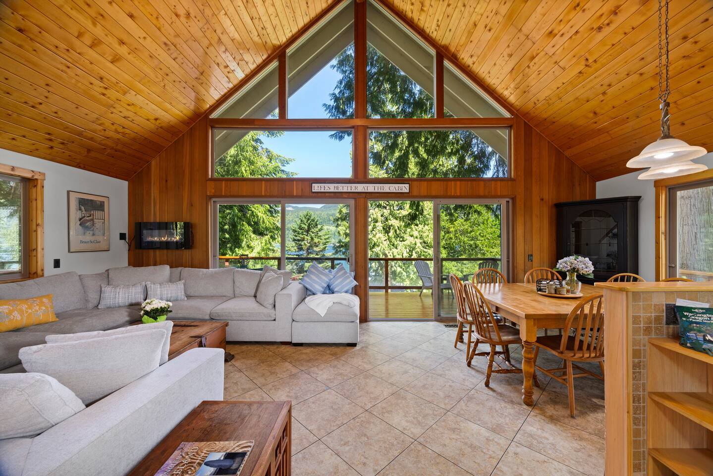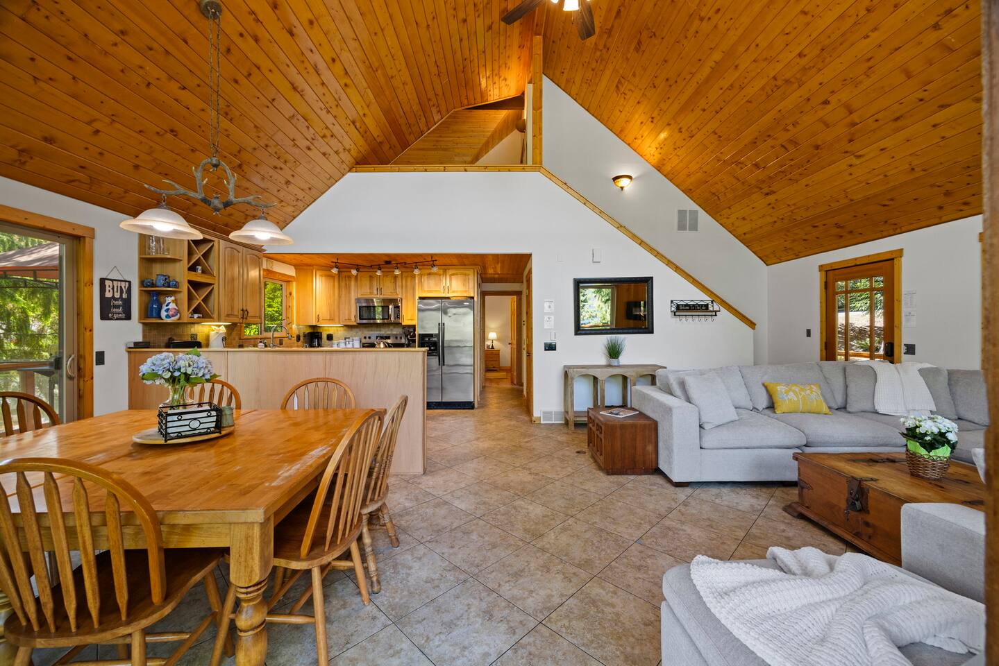 Whether you spend your days lounging by the lake or exploring nearby attractions, Lake View Chalet is the ultimate destination for an unforgettable vacation - family-friendly, pet-friendly, and breathtaking lake views! Across the street you'll find Sofield Park, offering a large grassy lawn and a sandy beach perfect for relaxing and swimming - kayaks and paddle boards are provided! Walking distance from the Marina, dog park, and a 18-hole championship golf course open to the public. Minutes from world-class mountain biking and hiking trails. There's no shortage of fun & activities here! Parking for up to 4 vehicles with FREE EV CHARGING! The three-level fully furnished home is designed for comfort and convenience. The main floor is bright and airy with an open-concept living and dining room, fully-equipped gourmet kitchen, and 3 sets of floor-to-ceiling sliding glass doors that open up to a private 700sqft wraparound deck offering stunning lake views, outdoor dining and a gas firepit and BBQ. There are two bedrooms on the main floor both with Queen-Size beds and private en-suite bathrooms. The primary bedroom on the lower level features a King bed, a private en-suite, and a desk set up as a dedicated workspace. The lower level family rec room is equipped with a flat-screen TV with all the streaming services, stereo, pool table, wet bar, and a 300 sqft deck through double sliding glass doors. The upper level of the home provides sleeping arrangements for up to 8 guests. The open loft area has a bunk bed, with a twin bed on top and double bed on bottom, and full bathroom that will always be available to guests. There is a 5th Bedroom that includes a double bed + three single beds. Enjoy the convenient location, with Downtown Bellingham just 20 minutes away, the US/Canada border 35 minutes away, Seattle and Vancouver BC Canada 1.5 hours away, and 1.5 hours to Mt. Baker.